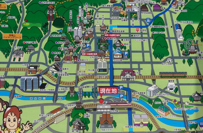 | 奥に見えるのは太鼓橋と桜門 | 東武伊勢崎線足利市駅前の案内板 ここから徒歩約15分 | |