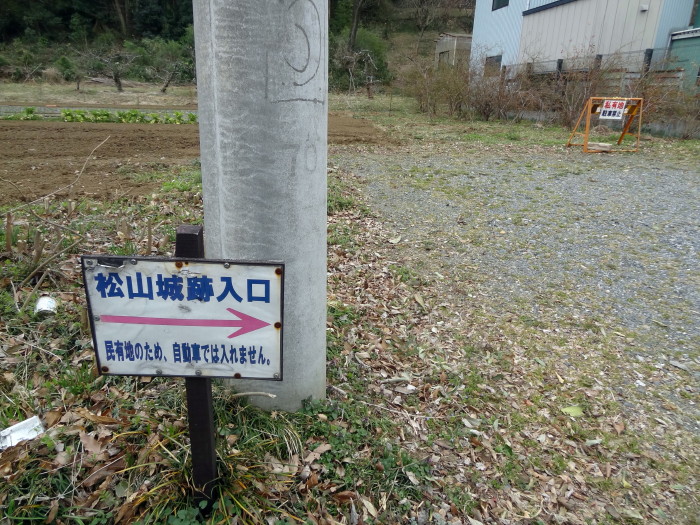 | 民家の敷地を通り、市街地の道路へ出る | ここで「松山城跡入り口」の標識を発見 | |