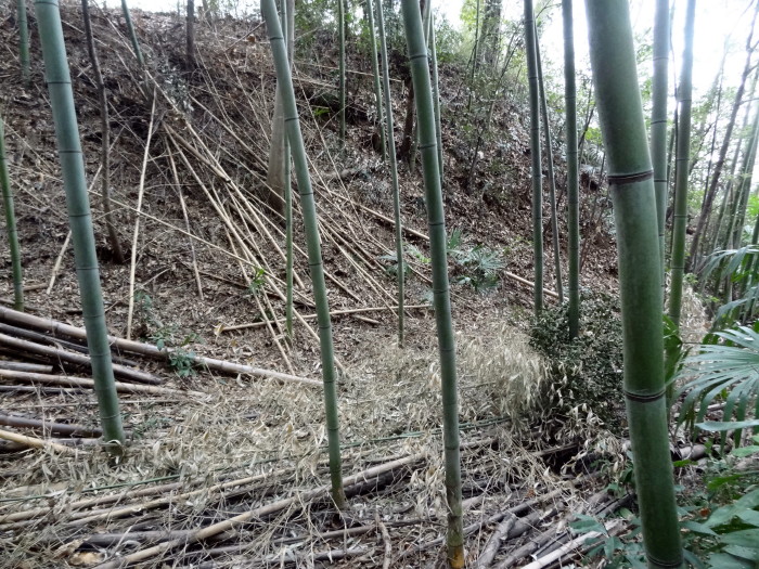 | 民家の畑の横を通り竹藪を目指す…ここに二重掘りと思われる痕跡が | 竹藪状態の堀のひとつ。この地点に降りるだけでも大変だった | |
