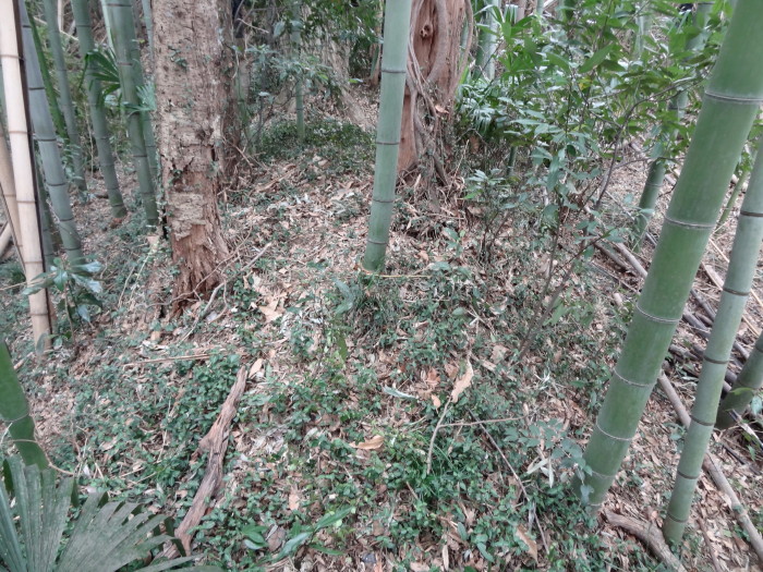 | ブルーシートの左に広がる竹藪が さっきの二重掘りのところ |