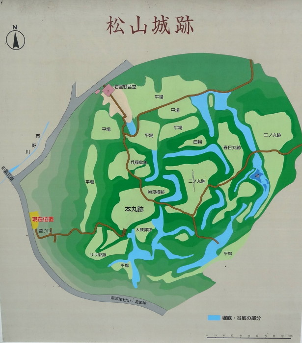 | 現地の案内板より…この地図の左下の「現在位置」の横の登り口より登城、先ずは本丸跡を目指した。 | 東武東上線東松山駅より徒歩20分ぐらい。 | |