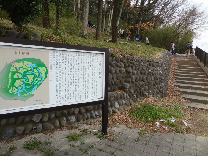 | ※ 松山城についての逸話として、風流歌合戦があり、北条氏綱が松山城を攻撃した際に、扇谷上杉の城代難波田弾正が味方の戦況不利なのを見て城に引き上げの際、北条方の山中主膳に和歌問答を仕掛けられたというもの。また、連絡用として初めて軍用犬が利用されたとか、武田軍が城攻めに際し、金堀職人を連れてきたとの攻防戦の話が有名。ルーシートの左に広がる竹藪が | ||