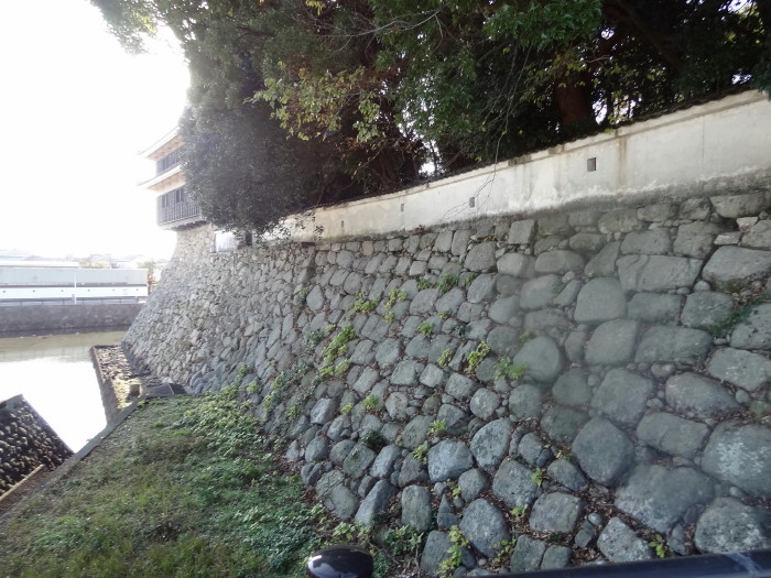 「普通車専用駐車場」のすぐ横にある場所…ここに黒田時代と細川時代の石垣が見られる。 |