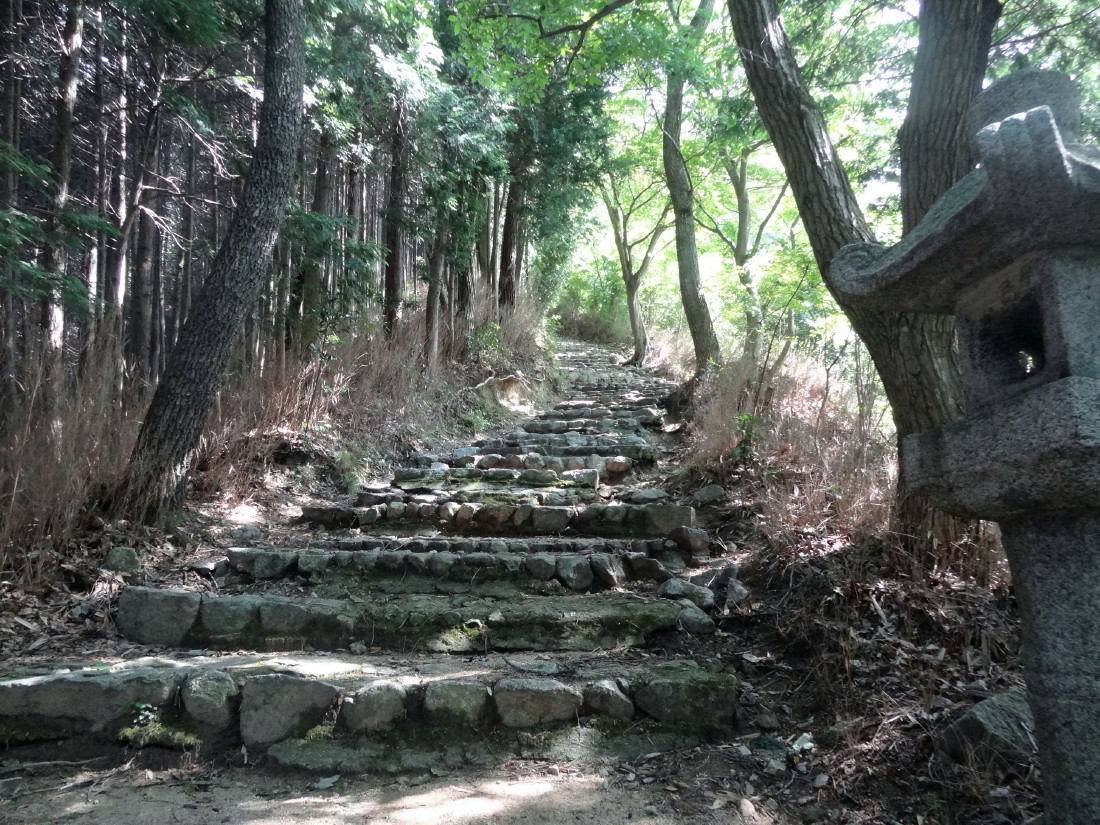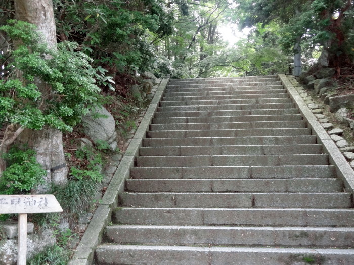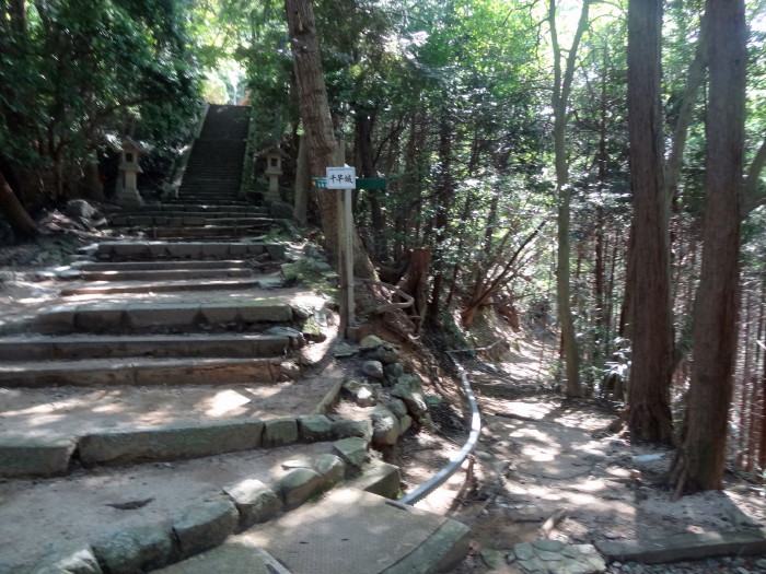 | 右の写真の鳥居を過ぎてひたすら石段を上がる。比較的緩やかな階段であり思ったよりは歩きやすい…五百数十段の階段で、城跡は府道との比高150米。 |