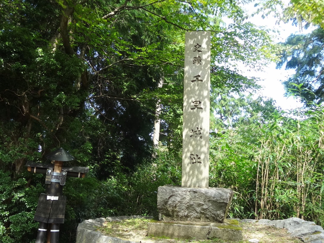 - 元弘2年(1332年)楠木正成が構築し、翌年5月まで百日間、藁人形等の奇策をもって鎌倉幕府軍の攻撃に堪えて建武中興の原動力となった難攻不落の名城である。標高660米で、城の南(妙見谷)、北(風呂谷)、西(大手口=現在地)の三方を急斜面で、府道との比高は150米。東方だけが尾根伝いに金剛山に通じる天然の要害である。五百数十段の石段を登ると四の丸があり、それより本丸までの奥行が約300米、その比高は約30米である。
