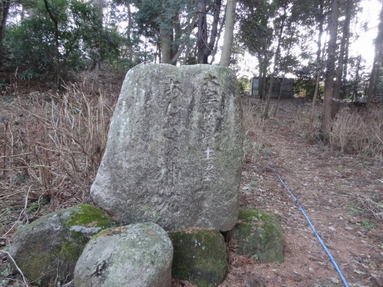 | 「大宝城跡土塁・あじさい神苑」との表示石碑…左手後方の土塁を指すのか(右下の写真の土塁) |