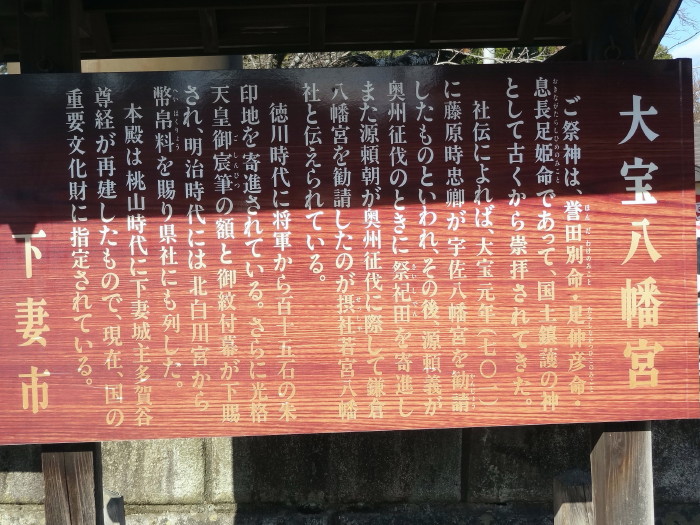 | 大宝城は、下妻政泰が大宝城の城主だった興国2年(1341)東国における南朝方の拠点となりました。北朝方との戦いが繰り広げられ、北朝方の猛攻を受けた末、食糧不足と城内不和のため落城し、城主下妻政泰は討ち死にしたと伝えられています。この下妻政泰を悼んで、大宝八幡宮には「贈正四位下妻政泰忠死の碑」と「下妻政泰公碑」が建立されています。(神社境内の大宝八幡宮の説明板より) |
