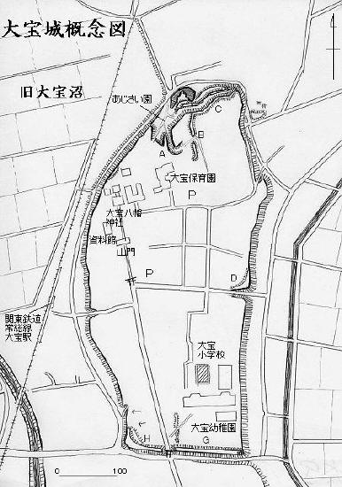 | 大宝城駅前にあった観光MAPより…関東鉄道常総線「大宝」駅から徒歩約5分で城跡・大宝八幡宮に |