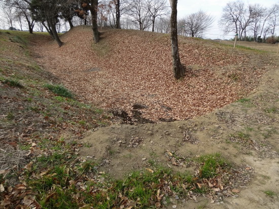 | 南側の堀…遠くに虎口のところ(下の写真の城址碑・案内板のあるところ)が見える |