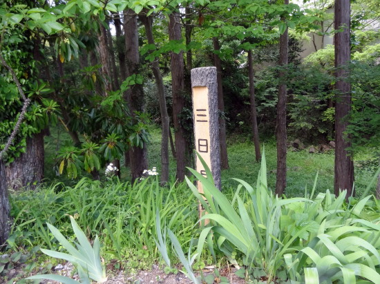 | 左上の二の丸中心部から、その下の写真の通路を降りてゆくと、右の写真の「二の丸」の標示柱…図面のG | ||