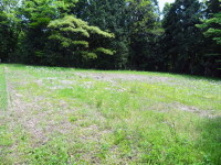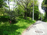 | 上の縄張図の @の場所…右の写真の舗装道路に入ってすぐ、左側に「三日月堀」の標示。右下の写真で三日月の形状が分かりますね | 案内板のところから左側の道路に入り、少し進むと左の写真の標示柱と堀が見える… | |