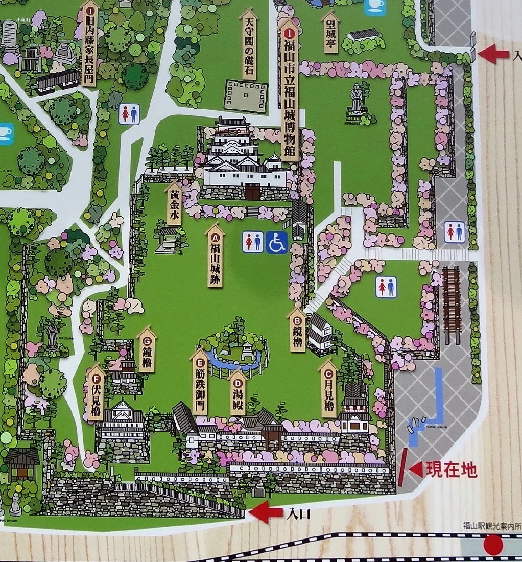 | 福山駅北口の前の説明版より抜粋。現在地のところから入城した。現存する建物は伏見櫓(伏見城から移築された)と筋鉄御門(すじがねごもん)…共に国の重要文化財。天守は空襲で焼失、現在の建物は昭和41年に月見櫓、御湯殿と共に復興された。各写真の説明は、入城時入手のパンフ及び現地案内板より引用させていただきました。 | ||