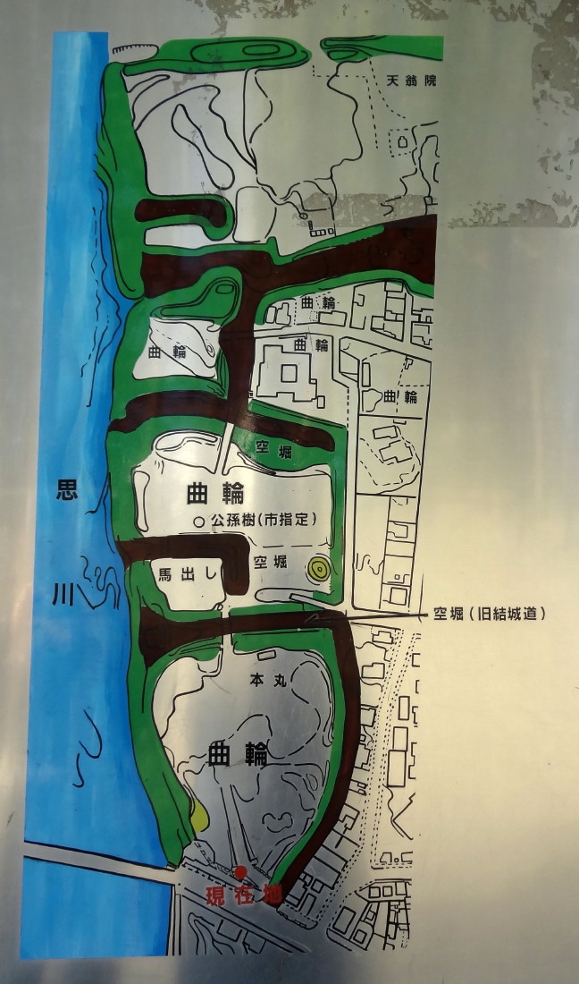 | 思川に面した西面は河岸段丘となっており高さ20m程もあるとのこと。下の縄張り図のように下から、曲輪~馬出し~曲輪~曲輪、とそれぞれ空堀を挟んで配されている | JR小山駅 | ||