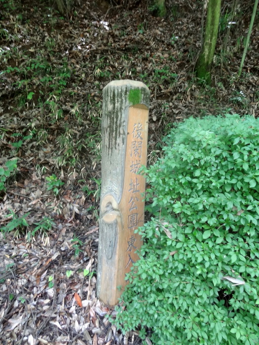 | 後閑城址公園東入り口の標示柱…現在地の場所からすぐ右の写真の山道(階段状になっていて歩きやすい) |