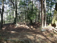 | 2郭に入って、主郭方向への虎口を見る…この先は枡形虎口状? | 2郭の入口(虎口)部分…倒木でふさがれているが通行に支障はない | |