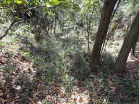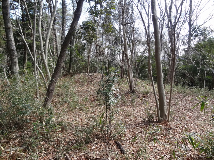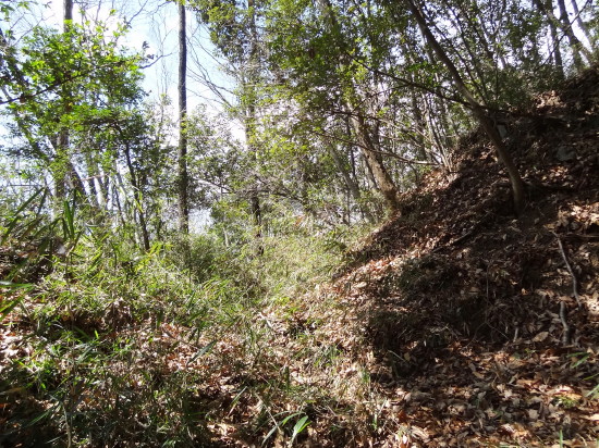 | 山頂近くの腰郭から西方向へ歩き、「堀4」らしい場所に出た…この辺は今までの竪堀と違い比較的緩い堀に見える |