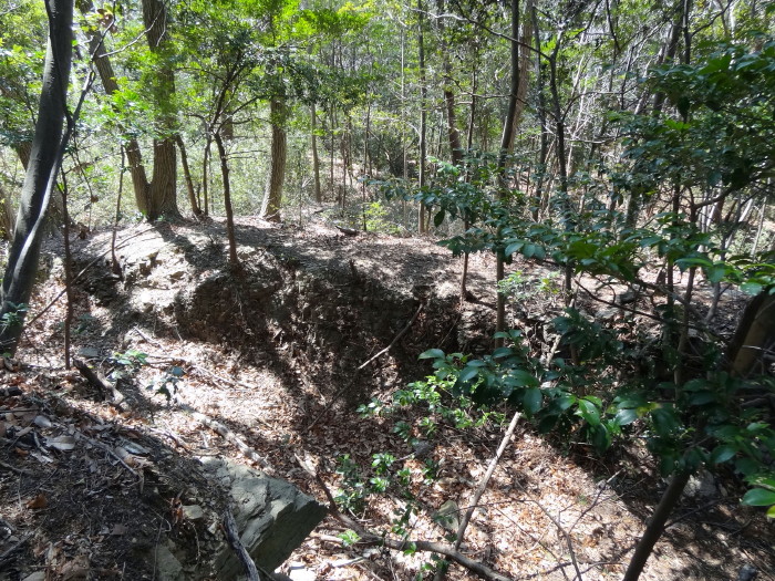 岩盤を削って作ったと思われる主郭西側の空堀… |