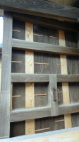 | この陣屋門は、江戸時代 府中松平藩の役人が詰めていた陣屋の表門。石岡小学校の校門として利用されていたが、老朽化や東日本大震災の被害を受けたことから、修復されるのを機に元あった場所(市民会館のところ)に戻った。白く見える木材が、生々しい…右の写真は陣屋門についての説明板で小学校内に設置されている。その下の写真は。陣屋門内部から見たもの… |