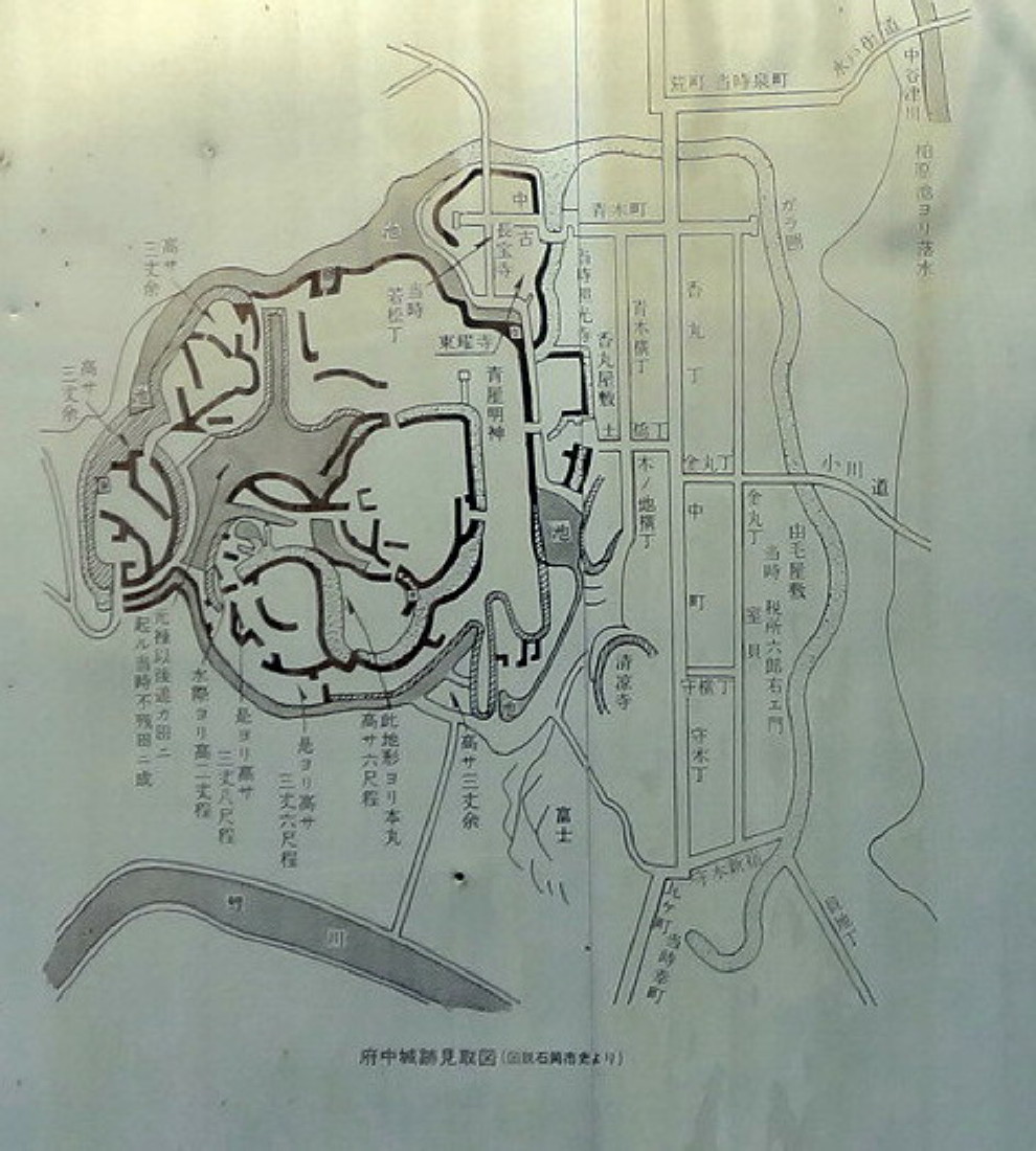 | 府中城の土塁の説明板…この縄張り図を右に拡大 |