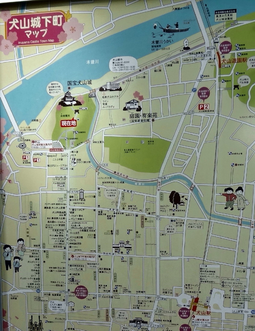 | 先ずは、犬山城と犬山駅の位置関係を見てください。木曽川沿いに歩いて犬山城へ行く場合は「犬山遊園」駅が便利。地図の下の方に「犬山」駅があり、そこから、寺内町通りから天守閣に向かった。…天守閣のところにあった案内板より。 | ||