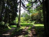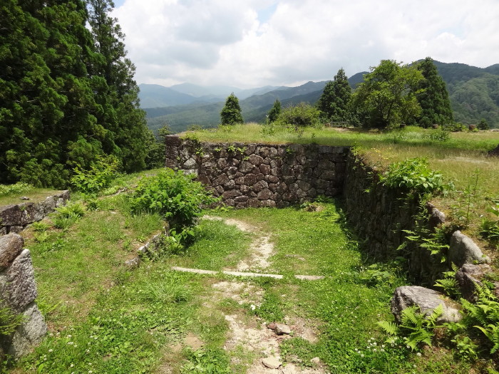 | 大手櫓門跡…岩村城の正門で城中最大の門。本丸まで200mの標示。 | 門を入って石垣の間の道を進む… | ||||||