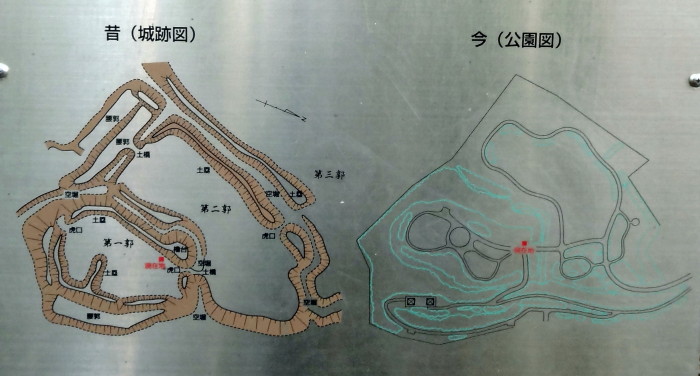 | 第一郭内にあった説明版…現在の公園の図面と比較できる、第三郭は今は宅地化されている |