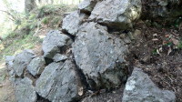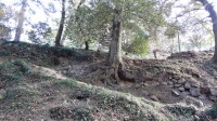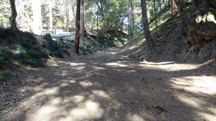 | 二の丸の虎口…この先に見えているのが「武者溜まり」。後方の、神社への階段の横の石垣(右の写真)と併せて、枡形を構成しているように見える。 |