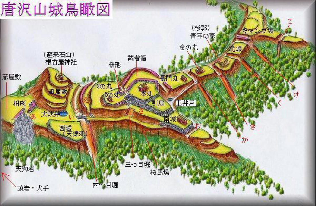 | 余湖くんのホームページ、「唐沢山城(佐野市富士町唐沢山)」より鳥瞰図を引用させていただきました。これで縄張図がよくわかると思います。余湖くんのホームページに感謝! |