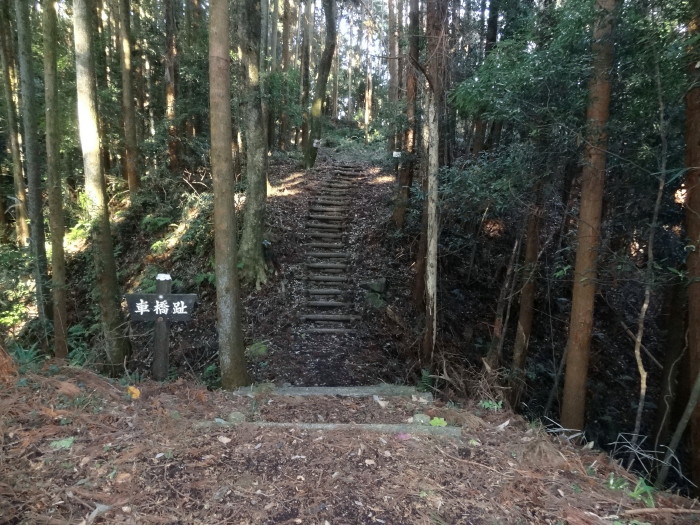 | このような標示道標が…奥に、右下の写真の「車橋址」の標示と大きな空堀が見える。 | 寿亀山神社から上がってきて、ここで右の城跡方向へ…左の写真に続く。 | |