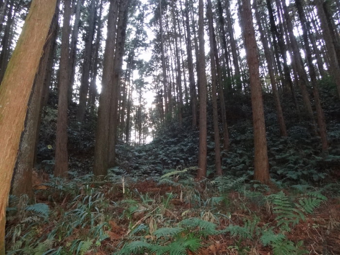 | 麓かなり広い~ | これらの杉の木々が無くて、建物群があったと想像すると、それなりの郭ですね。もう少し復元してくれると分かりやすいのだが… | |