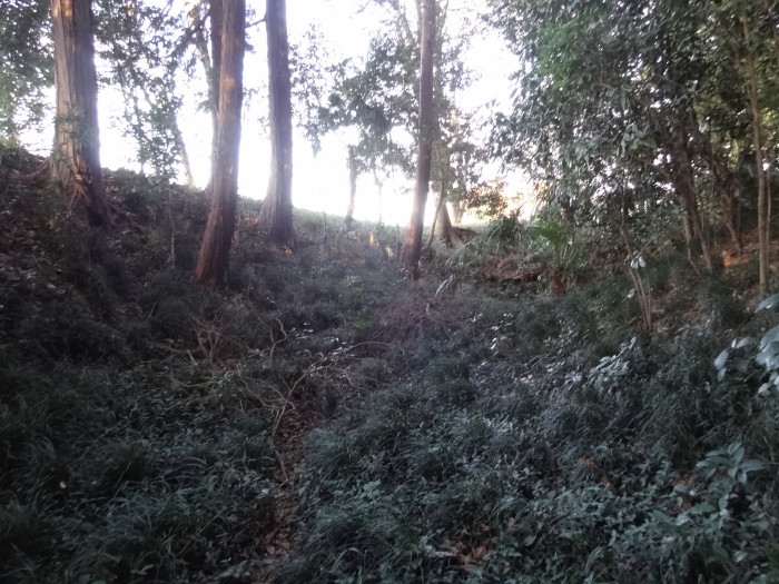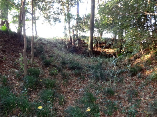 | ちょっとした削平地(左の写真)を過ぎて、左下の写真(堀底が見える)に続いて、最後に右の写真の、先ほど歩いた空堀の最後のところを見下ろす… | ||