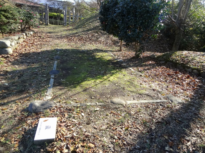 | 勝沼氏は、武田信虎の同母弟、次郎五郎信友によって興された武田親族衆の一員であり、信虎が戦国大名として台頭しようと苛烈な戦いに明け暮れていた時期に、最も信頼していた家臣でもあります。そのため、郡内小山田氏の目付として、武相口の護りとして適地である勝沼の地に館を構えたと思われます。天文4年に信友が戦死し、その名称を継いだ嫡子信元も信玄の有力な親族衆として、また家臣として常に重要な軍事力の一端を担ってきましたが、永禄3年に、逆心の企てが露見し、信玄によって処断されたと言われています。この主郭は勝沼氏館跡の中心に相当する郭で、二重掘りと二重の土塁で囲まれた敷地に建物跡、門跡、水溜、側溝、土塀など多くの遺構が検出され、当時の館内部の生活を知る上で大変貴重なものです。整備は16世紀初頭のころの郭内部の様子を、建物配置や通路順路、水溜、側溝の復元によって再現しようとしたものです。(山梨県・甲州市が現地に設置の案内板「国史跡 勝沼氏館跡」より) |