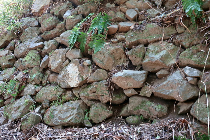 | 本丸の、北側に、若干下に降りる通路がある。何ら標識はないが、縄張り図的には、大沢見張り台方向であり、暫く歩く。歩き始めると左側(本丸側)に野面積の石垣が見えてきた…右に拡大写真。このようにまとまった石垣・石積みは他では見当たらず…元々は本丸(主郭)周囲にもっとあったのだろう。 |