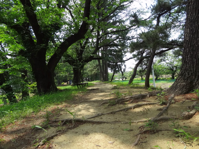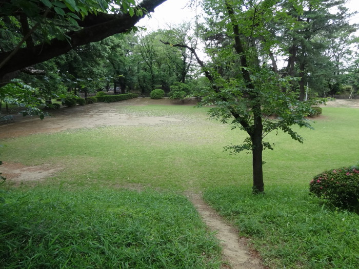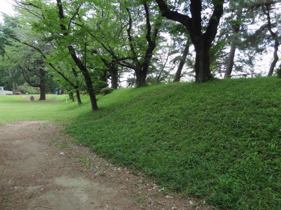 | 門を入りすぐ右側に北中学校(旧三の丸)…ここの土塁も残存している。ここは虎口か? | 西端の土塁上から西側を見る…水堀が見える。この辺で土塁が切れるので下に降りる | |