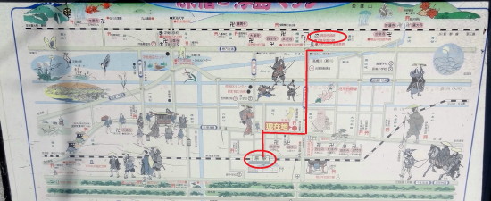 | 興国寺城通りの突き当り(@の地点)にあった案内図…写真の説明に当たり位置を特定すべく番号を振ってみた。また、各郭の名称も付記した。 |