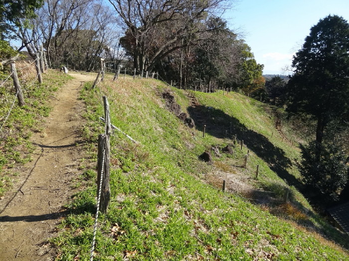 本丸手前の、神社への通路右側の大規模な土塁… |