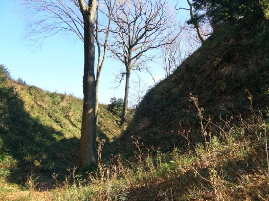 | 左側の土塁の向こう側に北郭が…深さ10m近くあるかも |