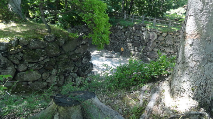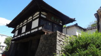 | 小諸城址三の門 「明和2年再建したもの、両塀に矢佐間・鉄砲狭間の戦闘式の建物」と標記されている | 三の門入口手前から左側に歩く…城下町より低いレベルの「穴城」の雰囲気が伺えますね! | |