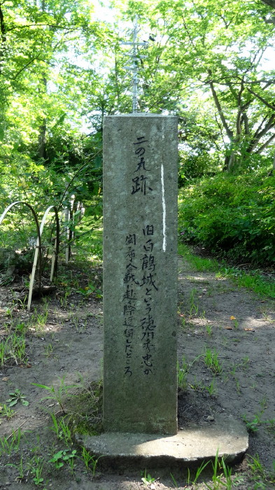 | 二の丸跡 旧白鶴城という徳川秀忠が関ケ原合戦に赴く際に逗留したところ | 二の丸の上に来た…周囲に土塁が残る。下を見ると急峻な崖! | |