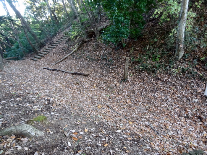| 二つ目の空堀…頂上まで150mの標示柱と階段(本郭を回る)が見える… |