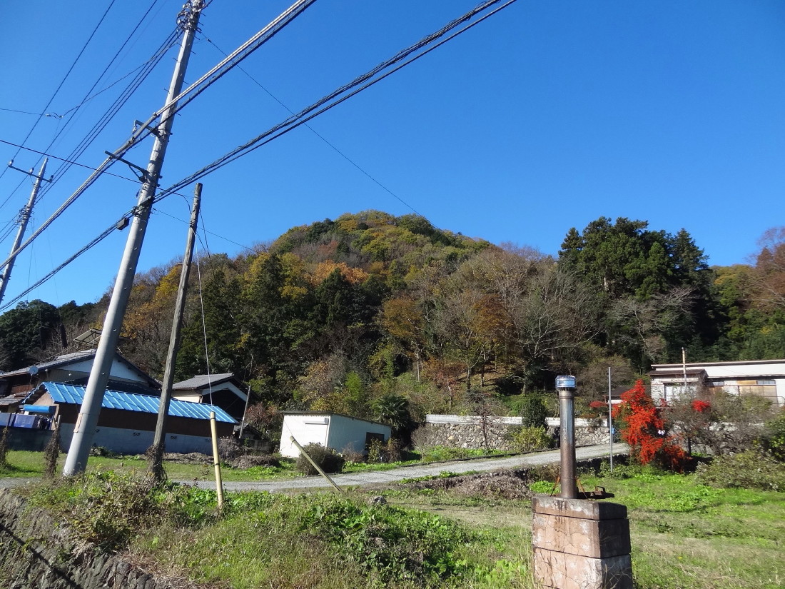 | 登山口近くの道路より「腰越城」のある山を仰ぎ見る… |
