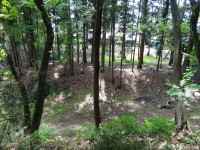 | 東側の土塁上から、主郭へ入って来た時の遊歩道のような通路と間の空堀を見下ろす… |
