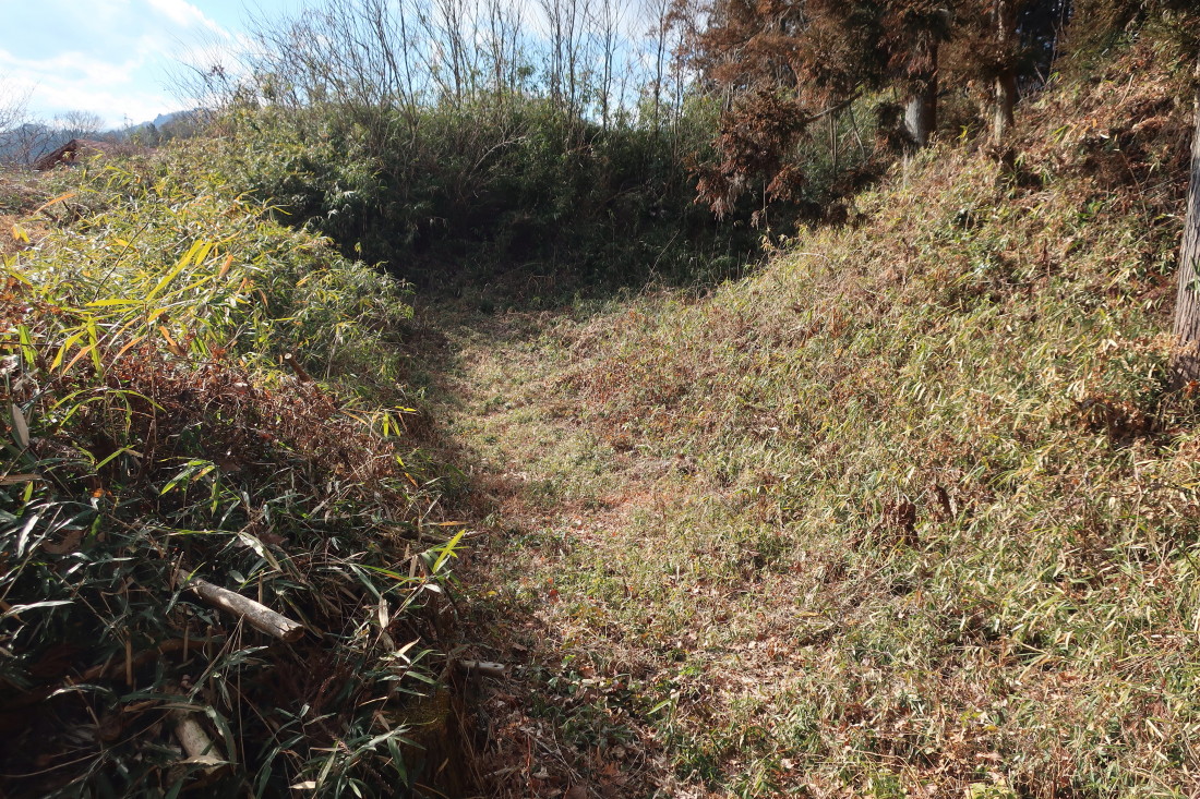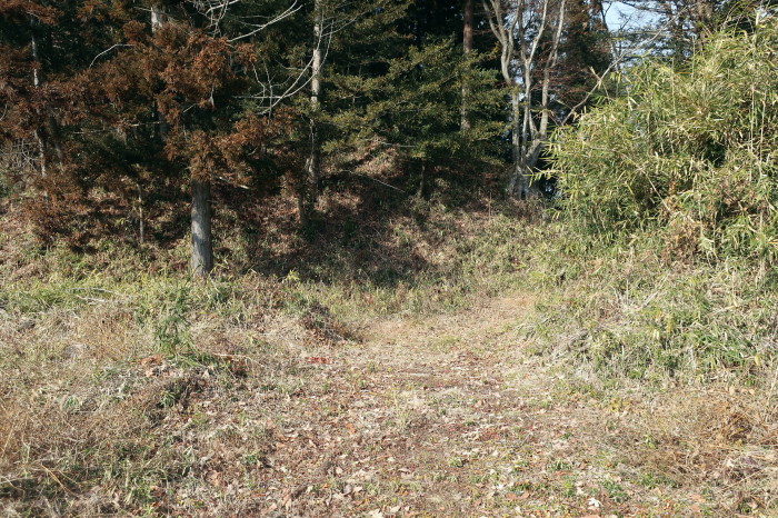 | 通路の先に虎口が見えてきた、その左右には空堀跡が見える)下の写真は左側、西側の空堀…撮影地点は土橋であった場所か |