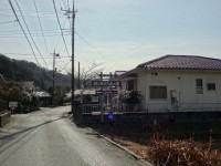 | 更に、尾根道を歩くと左側にフェンスが見えて来て、最初の舗装道路が左下に見えてくる… |