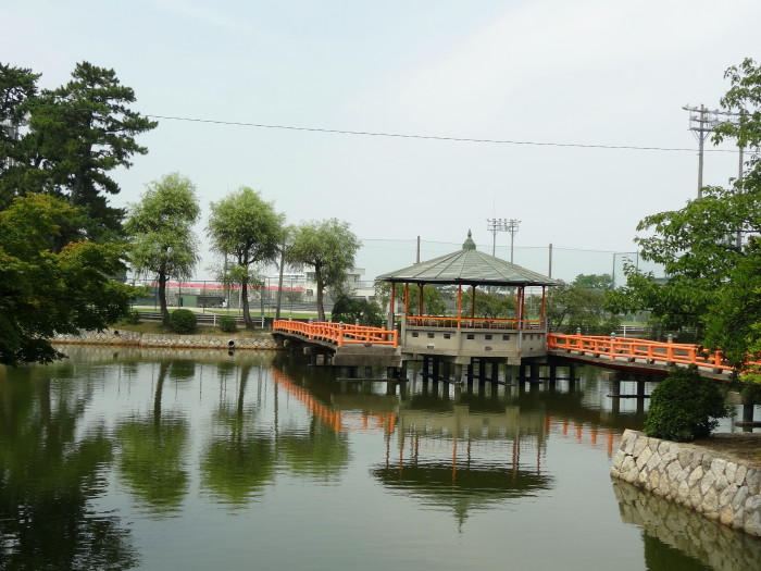 辰巳櫓跡より…赤い橋はすべてコンクリート製、石垣も近代のもの |