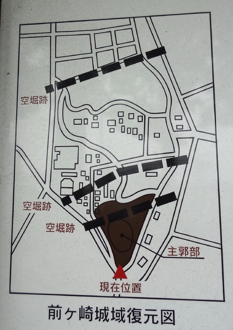 | 「前ヶ崎城跡」の案内板…説明文は冒頭に引用。城域復元図は下に拡大して掲示 |