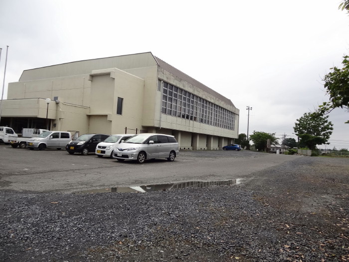 | 右上の部分からさらに奥の場所を見る…写真ではわかりにくいが横矢の掛かった堀・土塁が見える | こちらは昭和10年に建てられた城址碑(皇紀2595年と記されている)… | 本丸の目印となる体育館…ここの駐車場は広い。体育館のトイレも利用できる。 |