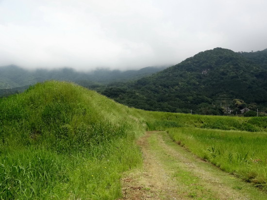 | 右上の写真の場所から、南方向の、堀に囲まれた部分を見る…草が生い茂っていて近づけない。中城と外曲輪の間の堀だろう。 | 上の写真の、土塁横の通路を進む… | |