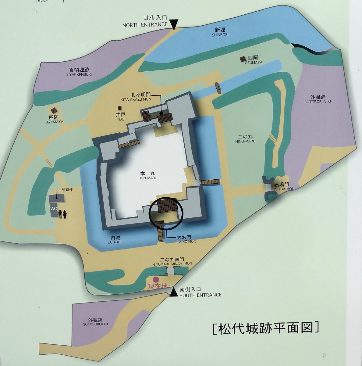 | 本丸御殿跡の周囲の石垣を北不明門側から見る | 井戸跡 | 北不明門(搦め手門)ー太鼓門と同様に櫓門と表門 (枡形門)の2棟による構成であった。 |