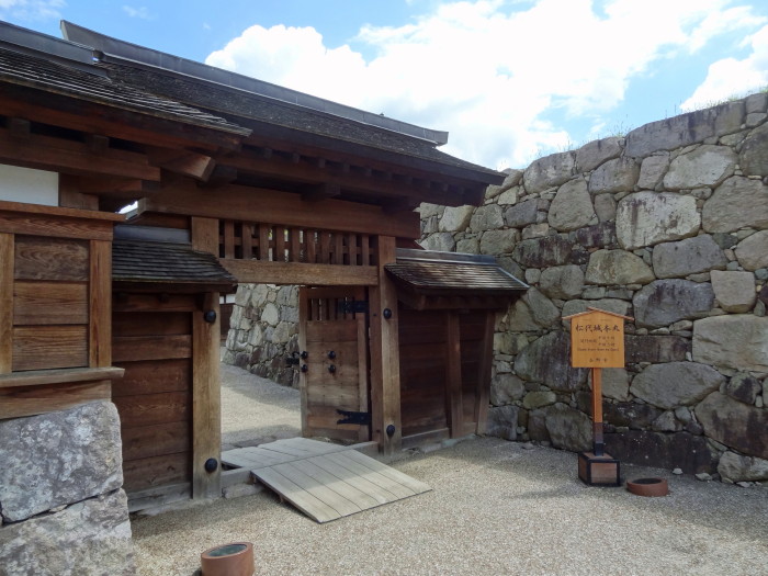 | 太鼓門は本丸内では一番大きな門であった。本丸大手(正面)の出入り口[虎口)は、枡形に石垣を回し二層の櫓門(太鼓門)と枡形門(橋詰門)の2つで構成されていた。 | 二の丸南門 | ||